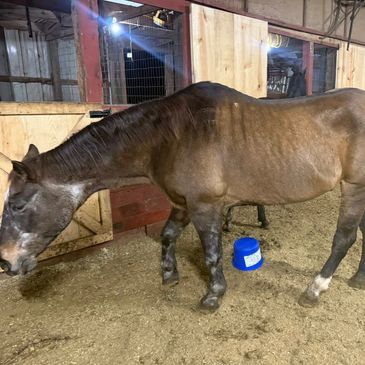 Like Sally, Gunnar requires soaked forage several times a day, along with 24/7 access to hay and fresh water. He’s a classic older horse who knows exactly what he wants: his meals, his comfort, and of course—plenty of treats and attention.