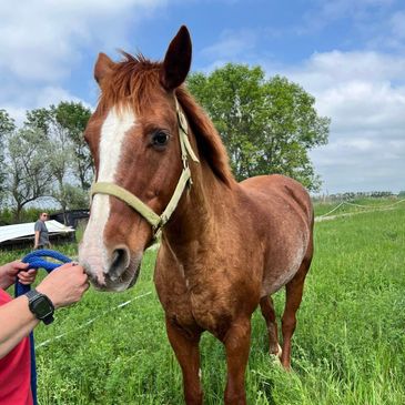 Phoenix is the last of our rescued mustangs, and she has stayed true to her independent, free-spirited nature. While she now wears a halter and allows handling, she’s not yet fully comfortable giving her head or fully trusting human guidance. Even so, she’s made remarkable progress—she can be tied, brushed, have her feet picked, and even stand for the farrier.